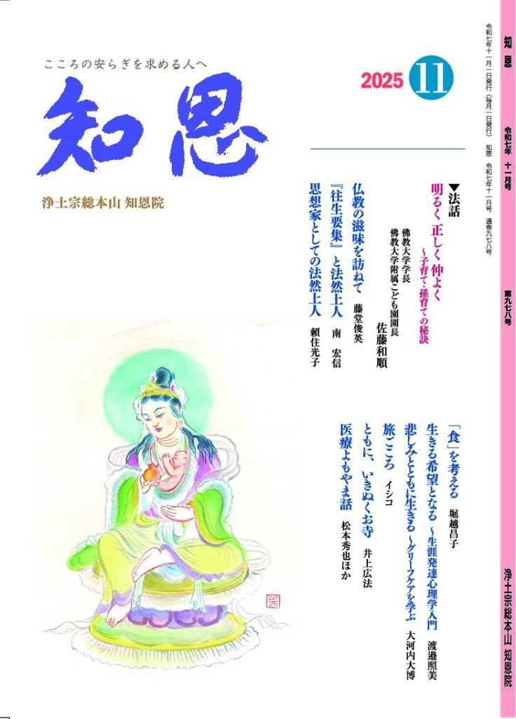 月刊「知恩」は、法然上人のみ教えや仏法をわかりやすく伝える読み物として、昭和24年に知恩院が創刊した雑誌です。より深く信仰を求められる方、心の安らぎ(サラナ)を求められる方へ向けて発行されています。