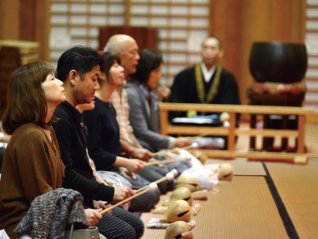 木魚を打ちながら「南無阿弥陀仏」とお念仏を称えよう。